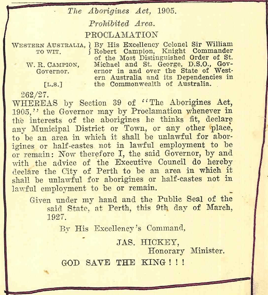 “[On] this 9th day of March, 1927,” “I … hereby declare the City of Perth to be an area in which it shall be unlawful for aborigines or half-castes (sic) not in lawful employment to be or remain”