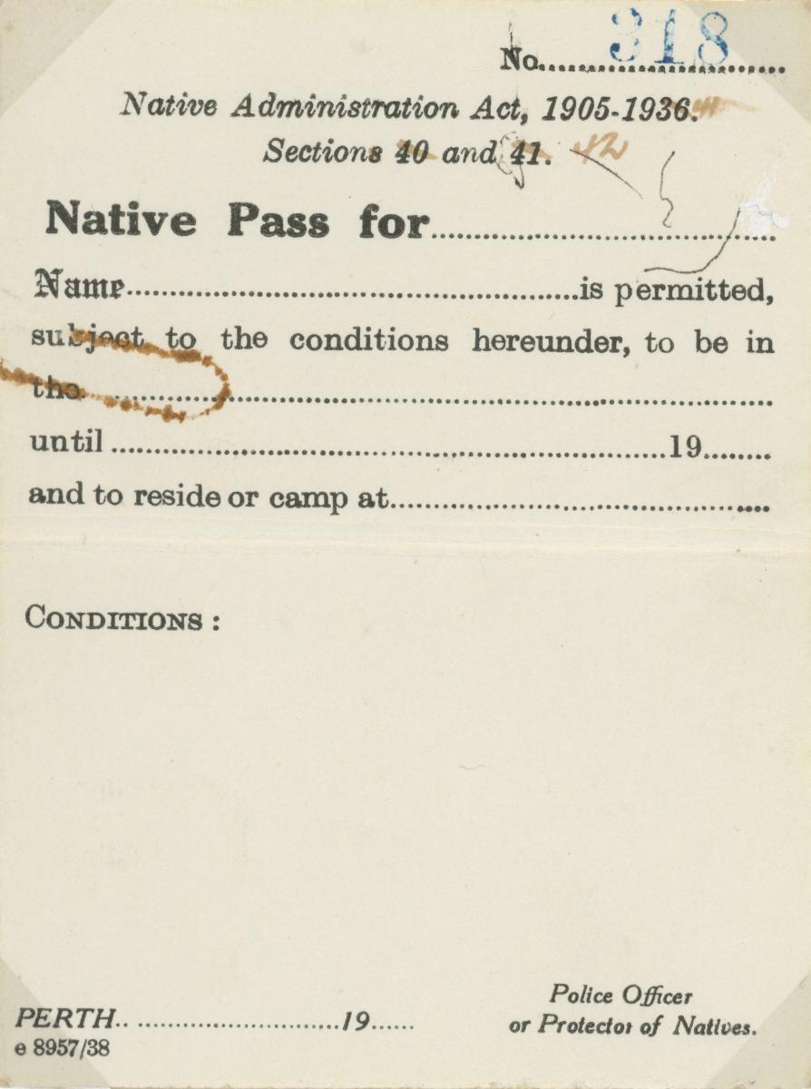 By mid 1937, a ‘Native Pass’ system was adopted wherein the Chief Protector or police officers had the power to issue Aboriginal individuals a pass to allow for conditional entry with the PPA.